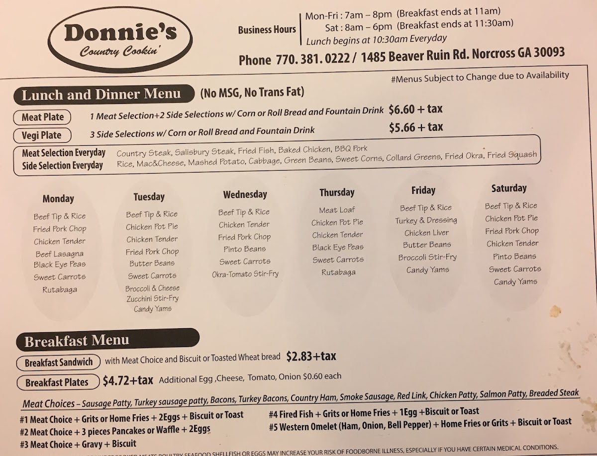 Welcome to Donnie's Country Cooking, a hidden gem located at 1485 Beaver Ruin Rd, Norcross, GA. This charming eatery specializes in wholesome, homestyle meals that evoke nostalgia with every bite.